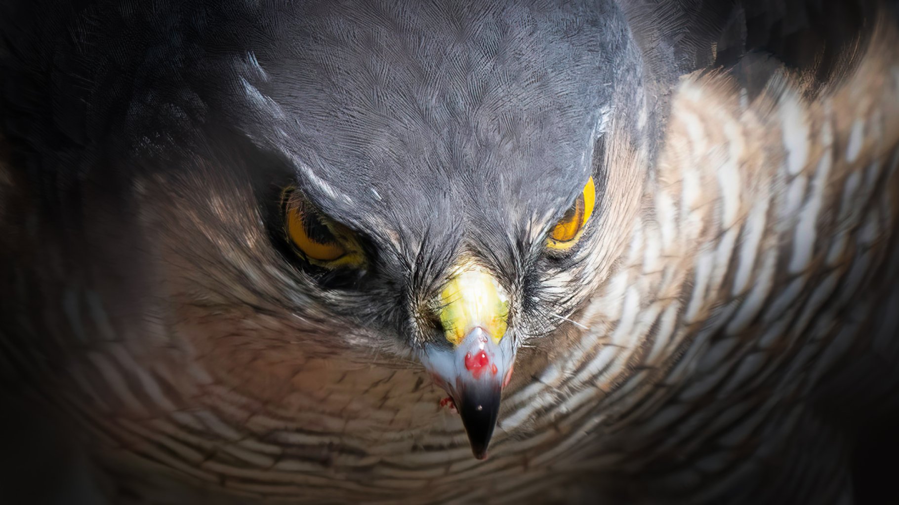 A sparrowhawk in our garden, happily devouring a small yellow bird. A canary? A little chick? No matter… the ravens arrived, the small birds squawked, and the female sparrowhawk put on that "are you really going to mess with me?" look, while blood was dripping from her beak. Cheers!