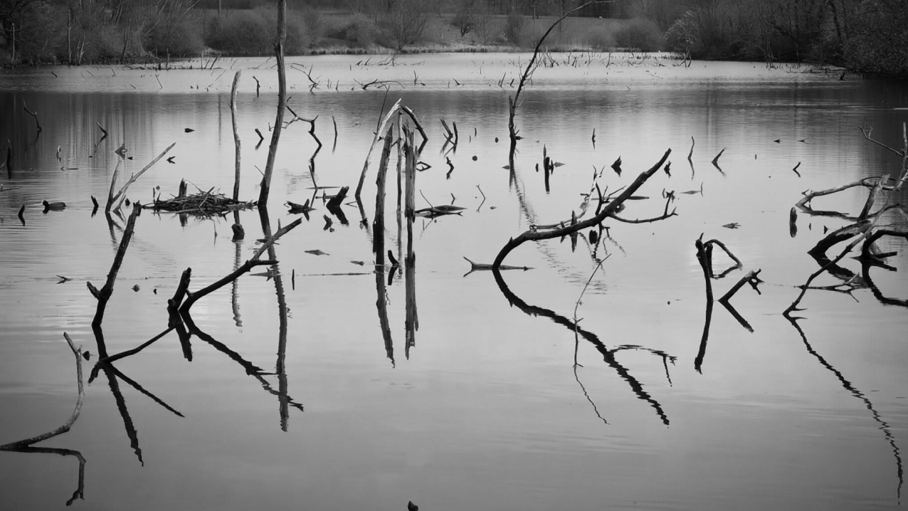 A monochromatic study of organic geometry. Skeletal branches and mirror reflections transform a still lake into a natural glitch of lines and symmetry—a meditation on entropy and static data.