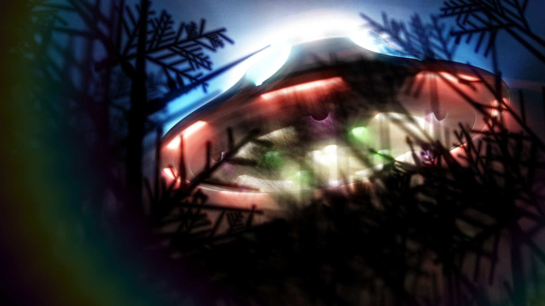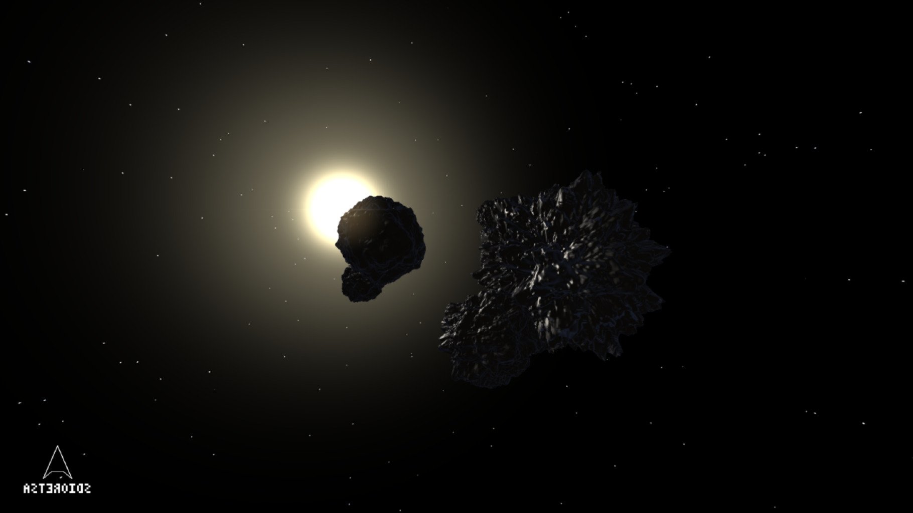 Dark rocks drift through backlit space.